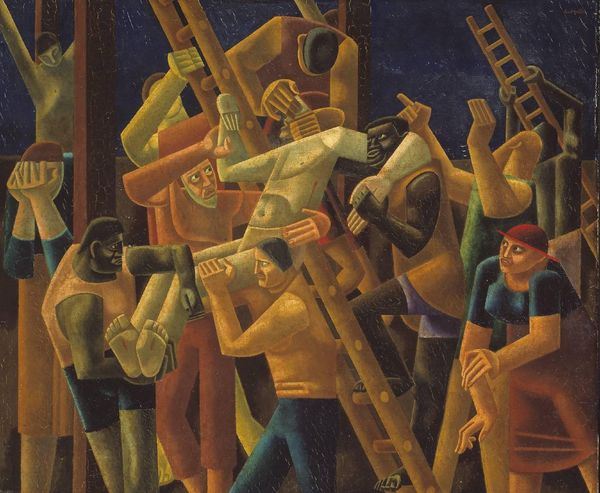 Curator: At Tate Britain, we see Mark Gertler's monumental canvas, "Merry-Go-Round." Editor: It’s imposing—the sheer size and those angular figures create a jarring, unsettling feeling. Curator: Gertler made it during the First World War. The riders, frozen in perpetual motion, seem like cogs in a machine of war. Notice the uniforms: they evoke the military. Editor: And the paint! It feels thick, almost sculptural, as if the figures were molded rather than painted. It's very far from the playful joy one might expect from the subject matter. Curator: Exactly. The merry-go-round traditionally symbolizes fleeting joy, but here it’s a relentless cycle of mechanized horror. The horses, usually symbols of power, are pale and lifeless. Editor: Considering the era, it's hard not to see this through the lens of industrialization and the way it reshaped labor and social life. Gertler made a powerful comment. Curator: Indeed. It serves as a potent symbol of cultural trauma and disillusionment. Editor: A truly unforgettable, if disturbing, piece.