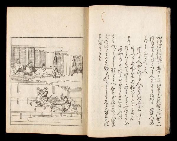Editor: Here we have a page from "Illustrated Guide to Kyoto," or "Kyō-suzume," by Asai Ryōi. It seems to be printed on paper, with simple black ink drawings and text. What stands out to you about it? Curator: I notice the depiction of labor and craft. Look at the tools and processes represented. What does this tell us about the means of production and the social context of this guide's creation and consumption? How does it blur the boundaries between art and everyday life? Editor: It’s interesting to think of this as documenting labor, I was more focused on it being an artifact. Curator: Exactly! The materiality of the book itself and the images of artisans at work highlight the connection between art, labor, and the consumption of culture. Editor: I now see that studying the materials and the depicted actions gives us a better understanding of its historical context.