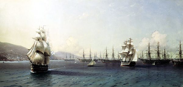 Curator: Look at this stunning seascape by Ivan Konstantinovich Aivazovsky, painted in 1852. It's titled "Crimea." Editor: Immediately, I'm struck by the light. The sky feels heavy with a preternatural calm, reflected somewhat in the water, yet contrasted with a churn. What does this painting mean in the context of Crimea itself, beyond a lovely depiction? Curator: The Crimean peninsula has a long and fraught history of cultural exchange and conflict. Situated as it is between Europe and Asia, control over Crimea has shifted many times, representing a flashpoint for ethnic and political tensions and struggles for power throughout its history, and even leading up to the present day. In this painting, made of oil paint, Aivazovsky offers his idealized vision of the peninsula during a relatively stable, perhaps deceptively serene period in that history. We must recognize that Aivazovsky, though celebrated, often presented a romanticized, arguably propagandistic view of Russian naval power. Editor: And that propaganda comes directly from the choice of materials and execution. Consider the way he depicts the ship. Notice the detail given to its rigging and sails. These are testaments to industrial craftsmanship and skill, objects of great value and, therefore, power in a burgeoning capitalist system. What do these vessels really signify for the populations whose lands border those churning waters? The labor invested is apparent; this is very tangible in how carefully, painstakingly the oil paints are applied. Curator: Indeed. Aivazovsky’s skill allows him to manipulate light and texture to evoke particular emotional responses, whether of awe or perhaps something more ambivalent considering Russia’s geopolitical ambitions at the time and since. Even seemingly simple landscape painting contains the opportunity to assert cultural and political hegemony. Editor: It all returns to material, process and context: both the immediate social contexts surrounding its creation and how those relate to what we, as modern viewers, experience now. This intersection shows how seemingly timeless scenes bear traces of conflict and coercion. Curator: It gives us cause to question even seemingly benign representations of landscapes or places—urging viewers to reflect on what perspectives are highlighted or suppressed, and whose narratives get centered or erased through visual imagery. Editor: Absolutely. Thinking about "Crimea" in this manner underscores how art is invariably bound up in the power structures, resources, and cultural dialogues of its era, reflecting both overt messaging and latent biases that persist long after the brushstrokes have dried.