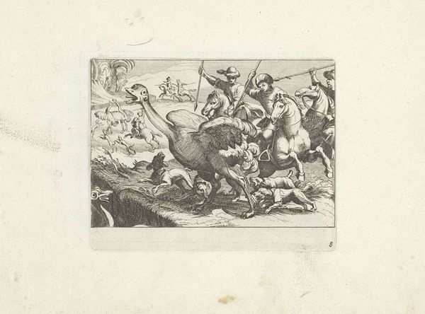 Curator: Let's explore "Fries met elf vogels, in het midden staat een grote vogel op een tak," a drawing crafted around 1607 by Pieter Serwouters. Editor: What a delicate little frieze! It’s an exercise in elegant restraint, this limited palette creating an intimate world. Curator: Indeed. What we see is rendered in pen and ink, typical for sketches in this era, especially within Northern Renaissance traditions. It captures a fascinating blend of naturalism and stylization in the avian figures. This sort of linear ornamentation was popular. Editor: The use of line, from what I can tell, generates texture without relying on traditional shading techniques. Note the various directions, from close-packed parallel lines to quick hatching. What statement do these birds make as symbols? Curator: The central, larger bird, perched atop a branch, evokes feelings of wisdom and protection. Flanking birds create community. This speaks to an age concerned with harmony, the avian community as microcosm of societal ideals and the winged spirit, not yet burdened by rigid scientific classification. Editor: And the placement of a big bird right at the core disrupts our focus and also ties us back, symbolically, to familial roots in storytelling. Curator: Exactly! These recurring bird motifs in Serwouters' time held deeper metaphorical relevance beyond surface recognition, reminding society of connections to nature, community, and wisdom. They function much like mnemonic triggers to remember virtues! Editor: As for me, the interplay of these dynamic lines holds enduring appeal— the simple arrangement contains infinite movement for eyes willing to wander a bit! Curator: For me it signals echoes from age old patterns of communication woven into shared memory; in these little sketches, they’re saying much about where we came from. Editor: Wonderful. Thanks!