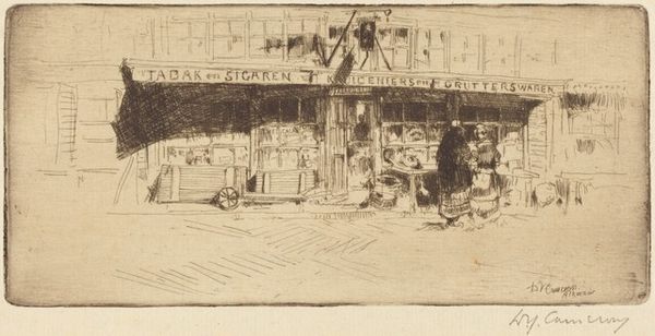 Curator: I'm struck by the immediacy of Whistler's "Rue de la Rochefoucault." It feels so vibrant, capturing a bustling street scene. Editor: Indeed. The etching process itself, with its directness, emphasizes the grit and labor of everyday life. The visible marks of the tool highlight the act of making. Curator: For me, the figures are key—the women shopping, the hint of lives intertwined with the marketplace. It speaks volumes about the role of women in Parisian society. Editor: Absolutely, and consider the materials. Etching allowed for wider distribution, making art more accessible to the burgeoning middle class. This challenges the traditional hierarchy of art. Curator: It also makes me think about the commodification of art and its impact on the artist. Was Whistler aware of how his art was circulating and who was engaging with it? Editor: He was certainly invested in controlling his image and the reception of his work, thinking about the market too. It is compelling how the work invites us to consider the relationship between art, labor, and consumption. Curator: This piece encourages us to consider the social fabric of 19th-century Paris, especially from the perspective of gender and class. Editor: Yes, through process and medium, we can glimpse the structures that shaped not only the image but society at large.