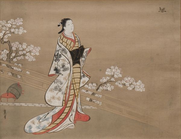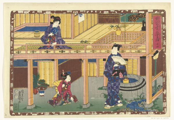 Editor: This woodblock print triptych by Kuniaki I, titled "Actors," really grabs you with its stylized figures and vibrant colors. What do you see in the composition and use of space here? Curator: The interplay between the figures and the geometric planes is compelling. Note how the woven screen backdrop creates a structured contrast with the organic forms of the chrysanthemums and actors' robes. Editor: Yes, the patterning is intense! Does that layered effect have significance? Curator: Indeed. The formal qualities—the juxtaposition of geometric and organic, the flat perspective—contribute to a dynamic tension. The interplay between the figures' static poses and the vibrant textile patterns creates a visually arresting experience. What do you make of that? Editor: I see how it activates the whole image. I hadn't thought about the tension, but that's definitely there. Curator: Exactly. Considering its formal structure reveals a depth of artistic intention.