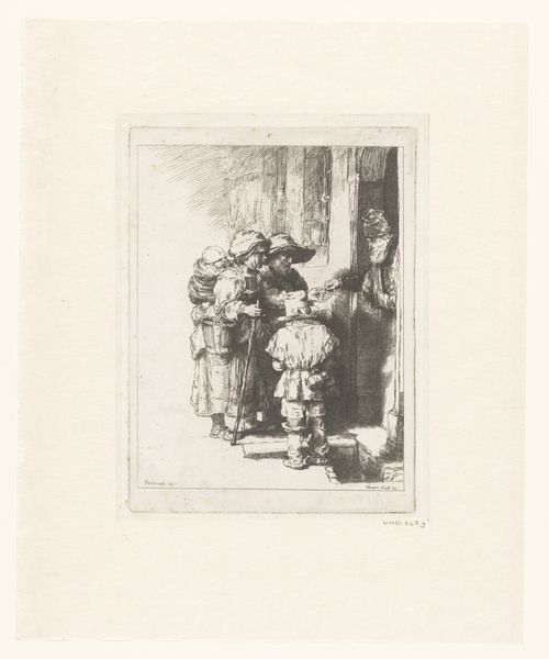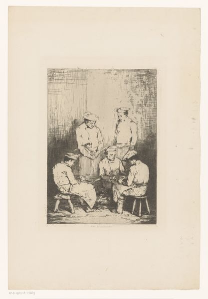 Curator: This drawing by Juan Antonio González, dating to 1880, is entitled "Salon with Four Seated Women and Men." What’s your initial impression, Editor? Editor: Restrained elegance, I’d say. The composition appears subdued; I immediately note the contrast between the fineness of the line work and the presumed affluence of the depicted subject, the figures of leisure. The pen on paper offers a fragile medium to capture this scene of upper-class domesticity. Curator: Indeed. Let's consider the composition. The arrangement of figures creates a visual rhythm. The lines of sight converge, almost forming a narrative ellipse—though the vagueness in execution keeps that interpretation elusive. Semiotics might frame that reading as a kind of symbolic closure without actualized form. Editor: For me, this speaks to the rise of industrial society and new technologies in manufacturing, affording the emerging middle class access to materials and skills, historically enjoyed only by aristocrats, as it speaks to any formal element. Pen and paper as tools, materials indicative of broader societal shifts. What social conditions would give rise to leisure and the means to portray such a life? Curator: That’s astute, connecting it back to industrialization. It leads to how academic art served its patrons, often presenting idealizations—almost like a constructed performance that upheld a certain worldview. Consider the texture conveyed with delicate, deliberate pen strokes. Note the gradations creating depth; and the careful distribution of light that enhances dimensionality in this salon scene. Editor: And where are such scenes staged and viewed? Consider the economic forces at play in producing the paper, inks, and then framing this "snapshot of high society” for potential consumption as commodity itself. And I am left wondering, who is the artist here, to those of higher classes? Did González benefit from this work, and how? Curator: An intriguing perspective that ties this artwork to systems of power, no doubt; but ultimately this salon drawing operates on an aesthetic level. Editor: Yet it's impossible to disentangle these social fabrics—it exists because of materials available, created, utilized, acquired, commodified, within defined material circumstances. That context shapes both creation and how we look at it today. Curator: Perhaps we find the strength of this art lies at this point of intersectionality—the push and pull of form and content in that context. Editor: Precisely, seeing art always entails examining not only the aesthetic results, but also the means and materials by which we produce its context.