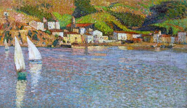 Henri Martin's painting "The Bay of Colliure near the Port" captures a picturesque scene of the French coast, rendered in a style that blends Impressionistic light with a Pointillist technique. Born in 1860, Martin lived through a period of significant social and political change in France, and this work reflects a yearning for an idyllic vision of rural life, away from the industrialized cities. The carefully constructed brushstrokes create a tapestry of color that evokes a sense of tranquility. The reflective surface of the water almost softens the contrast between land and sea. Consider what this serene bay might have represented to Martin and his contemporaries; a nostalgic escape from the rapid transformations of modern society. The choice to depict Colliure, a region with a rich history, suggests a connection to the cultural identity and heritage of France. Martin invites us to consider what it means to find peace in a world that is constantly changing.