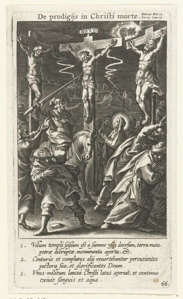 Editor: This is "The Crucifixion" by Abraham Hogenberg. It's a stark image, the figures so meticulously rendered with fine lines. What strikes me most is the composition, how the crosses dominate the scene. What do you see in its formal elements? Curator: Indeed, the dominance of vertical lines establishes a rigid structure, reinforced by the detailed hatching that defines form. The interplay of light and shadow, achieved through varied line density, adds depth. Notice how the artist uses foreground figures to frame the central event, creating a layered viewing experience. Editor: The layering makes it very dynamic despite the static subject. I see that now. Curator: Consider also the economy of line. Each mark is essential, contributing to the overall impact. It invites us to contemplate the artist's deliberate choices and the resulting visual tension. Editor: I’m appreciating how the lines create this contrast and depth. Thanks! Curator: My pleasure. The power of form, isn't it remarkable?