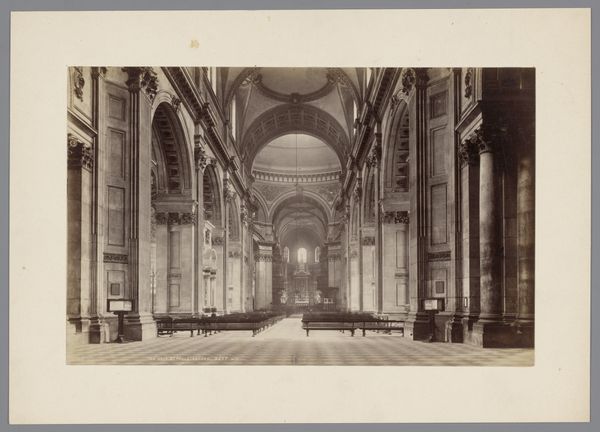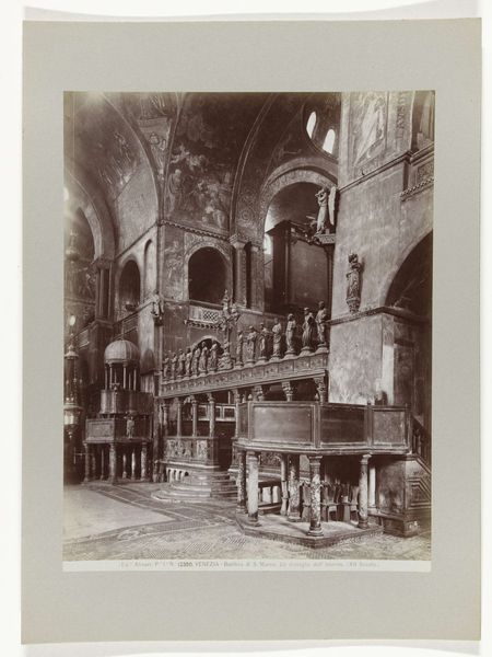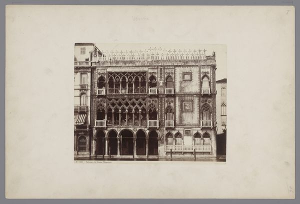 Curator: Here we have Carlo Naya’s photograph, “Gezicht op de Loggetta van de toren van de San Marco in Venetië,” likely taken between 1870 and 1890. It's a striking view of the Loggetta in Venice. What are your initial impressions? Editor: Imposing. The photograph has a rigid formality in the symmetry and clarity of detail. The muted tones, shades of gray and beige, make me focus on the structure itself and the meticulous arrangement of forms. Curator: Indeed. Naya's skill lies in capturing not just the appearance, but the very texture and structure of the building. Think of the socio-economic conditions that fueled such detailed craftsmanship, the guilds and workshops that produced it. Photography, in turn, transformed how these monuments were seen and circulated. Editor: True, but I see a more direct semiotic play. The arrangement of sculptures, arches, and even the positioning of the doors create a visual language—a coded message of Venetian power and artistic prowess of the Italian Renaissance. How the components interact is significant. Curator: But don't you think that’s too narrow? Look at how Naya chose to depict this public building—the viewpoint, the deliberate inclusion of other anonymous buildings on the left. These elements are not just about aesthetics, but the material culture of the city and its representation. These prints were a commodity too. Editor: Agreed that photography transformed architecture into a portable object, an experience to possess and circulate, so its market appeal can not be denied. Yet, the symbolic content is undeniably rich: the arches act as frames, the statues suggest virtue, each detail speaks to classical ideals. Curator: Perhaps. However, I am more compelled by considering Naya's technical process, from capturing the image to producing prints for a growing tourist market eager for a visual connection to Venice and for something to take back home as a memory. Editor: A tension exists between these poles. He captures Venice at this specific period but also offers an interpretation that favors symmetry and control—idealized notions of beauty. Curator: A balanced view. Both the immediate impact of the photograph and its implications regarding production and consumption are inseparable. Editor: Indeed, and I feel the dialogue between these elements enhances its significance.