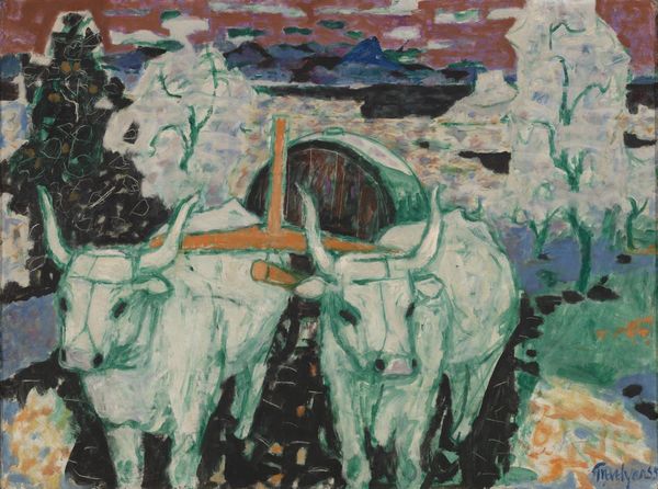 Curator: Raoul Dufy’s large painting, “The Kessler Family on Horseback,” presents a fascinating group portrait. There's no specific date for it. Editor: It's whimsical! The thin paint and visible canvas give it an airy feel, almost like a memory. Curator: Indeed. Dufy, with his background in decorative arts, often blurred the lines between fine art and design. The Kessler family were textile manufacturers; it makes you wonder about the commission and Dufy’s relationship to the industry. Editor: The quick, almost careless brushstrokes and limited palette speak to mass production. It’s interesting to think about how the manufacturing process mirrors Dufy's painting method here. Curator: It certainly challenges the notion of the artist as a solitary genius. Dufy was deeply embedded in the social and economic fabric of his time. Editor: Right. We see the Kesslers depicted with their wealth and status. The labor and materials are all there, in the final product. Curator: Looking at it through both our lenses offers a richer appreciation of the painting. Editor: Absolutely. It is a complex interplay of high art, craft, and social history!