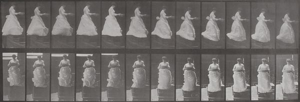 Editor: This is Plate Number 95, "Ascending stairs with a basin in hands," a gelatin silver print from 1887 by Eadweard Muybridge. What strikes me immediately is the grid format and how it captures a sense of motion. How do you interpret this work in terms of its composition and the choices made by Muybridge? Curator: The power here lies precisely in the structural juxtaposition. Muybridge meticulously fragments movement into discrete units, arranged in a grid that reveals the underlying mechanics of human locomotion. Consider how the rigid structure contrasts with the flowing lines of the figure's dress and the arc of her arm. This tension highlights the artist's project: an almost scientific deconstruction of organic motion. What meaning emerges from this interplay between the organic and the grid? Editor: That's a great question. It's as if he is trying to dissect a natural process into something understandable, almost mechanical. Does the basin the woman carries have significance or symbolic value within this structural framework? Curator: I believe the basin is another variable – like an experimental control. It complicates the lines of movement and introduces new arcs and weights into the sequence, thus enhancing the sense of depth in the study. It accentuates how body mechanics deal with external forces. Ultimately, it's an artistic rendering, which, viewed analytically, dissects reality into comprehensible data. It provokes a semiotic inquiry: what underlying messages does the structure encode about our perceptions of motion and the passage of time? Editor: It's fascinating to see how the piece's aesthetic presentation underscores an analytic intention. Thank you. I am leaving with new ideas about how structure and the breakdown of action informs the nature of experience. Curator: And I am reminded that this meticulous formal analysis doesn’t exist in a vacuum; Muybridge’s work has implications that touch many aspects of art and our broader culture. A truly impactful creation!