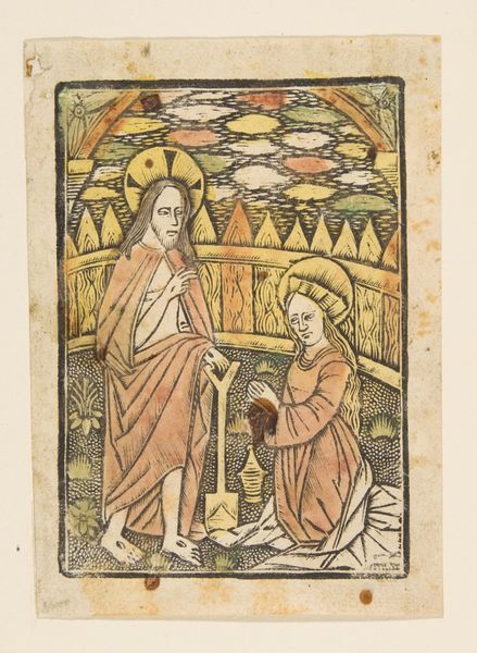Editor: We're looking at "Christ Appearing to Mary Magdalene," a woodcut and engraving that dates back to around 1500 by an anonymous artist. I’m immediately struck by the raw emotion captured despite the relative simplicity of the printmaking medium. What's your read on this scene? Curator: It hums with a unique kind of devotional intensity, doesn't it? It feels almost theatrical, the way Christ’s figure looms against the detailed, dreamlike landscape. And yet, something’s a bit… off-kilter, wouldn’t you say? There’s a Northern Renaissance interest in detail, yet also something almost naive about the perspective. Does the print give you any particular feelings about the narrative, how would you interpret this scene? Editor: Absolutely! It's like two separate realities coexisting. The stiff posture of Christ versus the tenderness implied in Mary Magdalene’s offering…It creates a push and pull. And it's that almost awkward juxtaposition, a very visceral reaction, which stays with you, right? Curator: Precisely. Remember, woodcuts at this time were often hand-colored, intended for mass consumption. It’s about making a direct, emotional impact. It captures the core message and personal grief, rather than the perfection of anatomy. The engraving details draw your eye around the artwork, while the figures provide an immediacy – almost like we're right there. Editor: This piece reminds me that visual storytelling doesn't always need perfect realism to be impactful. Curator: Exactly. It's about emotion, belief, and a unique kind of creative expression. That's what art offers - a way to transcend pure representation. It’s rather thought-provoking, really.