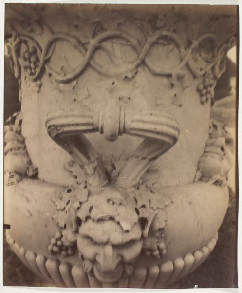 Curator: I am struck by its stillness. It has this contemplative almost stoic quality, this ancient bull in repose. Editor: Precisely. We're looking at a photograph of a sculpture, thought to be Nandi, Shiva's vehicle, possibly taken by Isidore Kinsbergen sometime between 1864 and 1867. The sculpture itself comes from the Dieng Plateau in Central Java, dating back to the 8th or 9th century. Curator: Java! That’s interesting, it looks like ceramic to me. There is a heaviness to it despite its recumbent posture. I would imagine that relates back to how it was originally worked. What would a piece like this have meant to its makers and audience? Editor: Well, Nandi, the bull, serves as a potent symbol in Hinduism. He's not just a ride, but a gatekeeper to Shiva, representing strength, faith, and devotion. To behold Nandi, whether as a statue or a temple carving, it’s an entry point into connecting with Shiva himself. The iconography surrounding it goes back centuries with rich cross-cultural presence across different Asian temples, especially of the Chola Dynasty. Curator: Given the volcanic soil composition of Java, you have to wonder how it affects the choices and limitations facing the original sculptor when they are thinking about materials for Nandi. But also this highlights something critical about its later role in cultural memory. Editor: It certainly highlights a blending of practical resourcefulness with symbolic weight. A great deal hinges on availability and access to different sources in antiquity. Curator: Absolutely. It emphasizes that artistic creation doesn't happen in a vacuum. Material circumstances leave traces in the form, as this photograph illustrates, so powerfully, so much later. Editor: It also speaks to a continuation of beliefs and artistic practices over centuries in a singular, visually striking form, I find that compelling. Curator: As do I. This really gets you thinking about time, endurance, and the layers of meaning we attach to these objects.