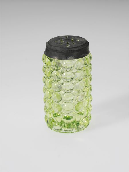 Editor: Here we have a pepper caster crafted somewhere between 1885 and 1888 by Richards and Hartley Flint Glass Co. It’s currently held at the Metropolitan Museum of Art. I’m struck by its simplicity. It looks almost… organic, like a futuristic lime-flavored pod from a retro sci-fi film. What are your impressions? Curator: Ah, yes! It’s deceptive, isn’t it? It looks unassuming, a simple utilitarian object, but consider the artistry involved. The repetitive molded pattern almost dances with the light. Notice how the green tint subtly shifts, deepening in the recesses between the bubbles. Does that evoke anything for you? Editor: Well, now that you mention it, it does bring to mind textures in nature, maybe even insect eyes, albeit a less creepy version! It feels both manufactured and somehow alive. Curator: Precisely! And don't dismiss its ordinariness so quickly. Isn't there a certain comfort in finding beauty within the mundane? Think about the dining tables it must have graced, adding just a pinch, both of seasoning and style, to everyday meals. A tiny, joyful rebellion against the practical. Editor: That’s a beautiful thought! It transforms something basic into something...poetic, even. Like a hidden pleasure in daily routines. Curator: Exactly! It reminds us that art isn't always about grand gestures. Sometimes it's the quiet elegance of a perfectly formed pepper caster. It makes you wonder about all the hidden artistry surrounding us, doesn’t it? Editor: It certainly does. I’ll never look at a pepper shaker the same way again! Thanks for sprinkling your perspective. Curator: And thank you for seeing the extraordinary in the ordinary.