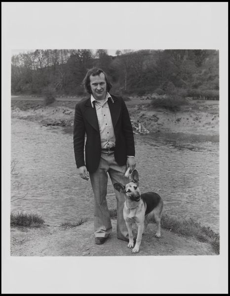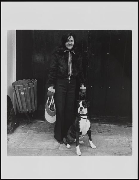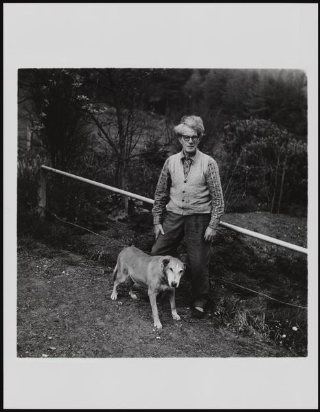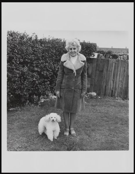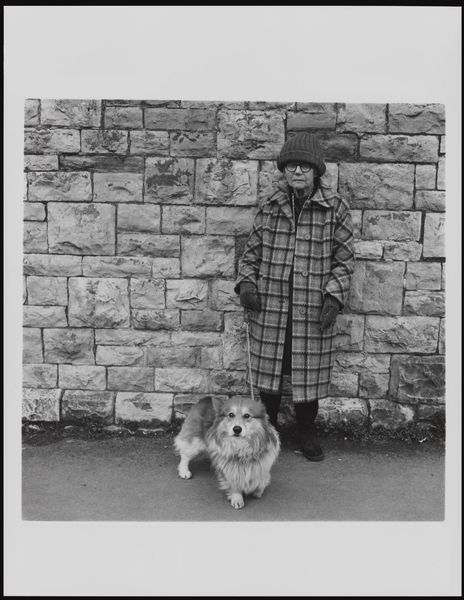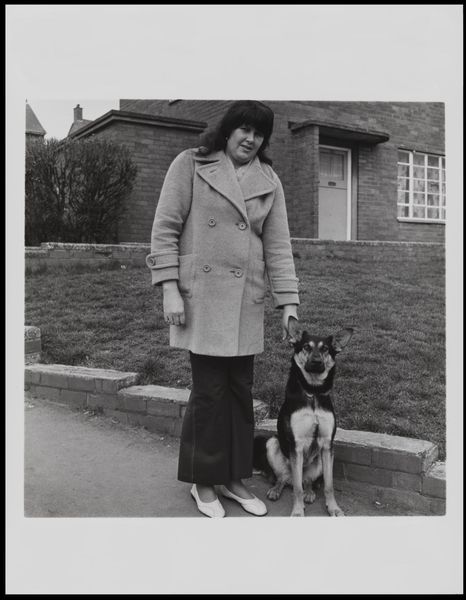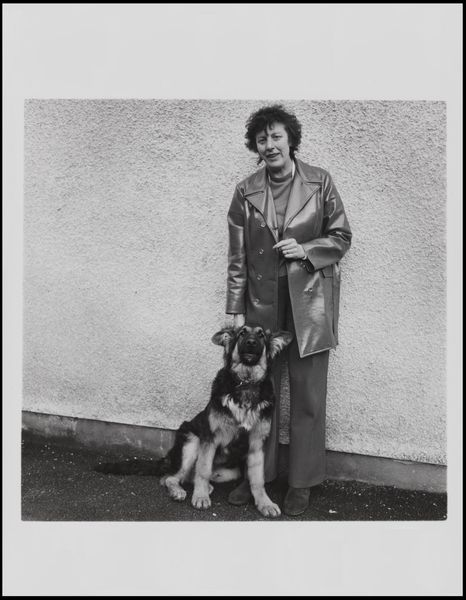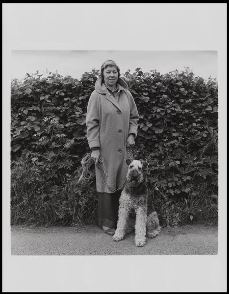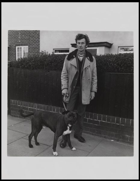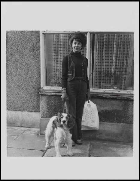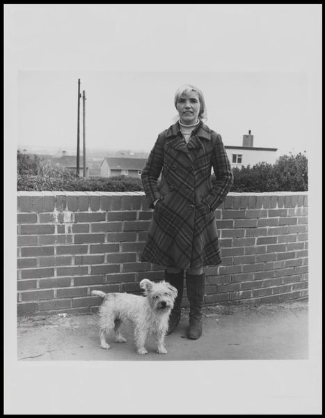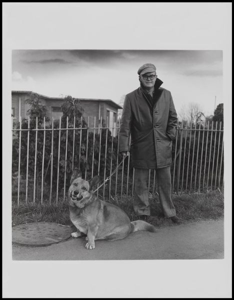 Curator: Here we have Keith Arnatt's "Walking the Dog." Editor: What a melancholy photograph. That poor dog looks positively mortified! Curator: Arnatt, born in 1930, explored conceptual art. This image challenges conventional representation. The banality of the title clashes with the carefully staged composition. Think about how gender roles are presented, how class is subtly performed. Editor: It's the very picture of suburban ennui, isn't it? The bleakness! The leash looks like a measuring tape. Is this a portrait of… control? Or conformity? I feel bad for the dog. Curator: The work, devoid of sentimentality, invites us to question the power dynamics within seemingly ordinary scenes. Editor: It makes me wonder, are we all just walking someone else's dog?