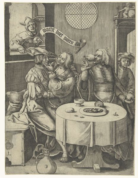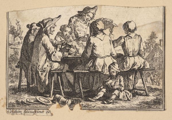 Curator: This engaging print, "Men Seated Around a Punch Bowl, with a Hunter Offering a Toast," comes to us from the hand of Thomas Bewick and dates from 1790 to 1828. Editor: Well, I immediately feel the energy in this small scene. It is joyous—but there is a nervousness. You can just imagine the clinking of glass and excited yelps from those pups below! Curator: Absolutely! Bewick captures such revelry. It's an engraving, you know, which speaks to how these images could be widely distributed. This was meant to reach people! Editor: A key factor, especially in pre-photography eras. This print isn’t just about merriment. Note the array of tools on the table– knives, what seems to be a lancet. Consider the paper itself; each impression bearing the weight of Bewick's labor and craft. I bet most drinking around punchbowls don’t get immortalized. Curator: Exactly. Think about the symbolism present, too! A toast elevated by the man atop the table. What celebration led them to this state? Editor: Perhaps the "hunt"? You get such prints distributed widely and that transforms the culture. Even the act of commissioning prints was one more task undertaken by the class of men represented around the table. I always wonder what sort of paper, ink, or stylus was favored by this or that engraver; what informed their production value! Curator: Those dogs, ever hopeful, complete the tableau. One lying low—in contrast with one man atop the table! This domestic bliss captures more, certainly, than the act of drinking itself. This image has warmth; I see an affirmation of life. Editor: I agree! And yet, thinking of its materiality only deepens my sense of its importance and how integral images are. The tools that men need: glass, dog, blade, ink! Curator: Thinking about it now, for Bewick it feels like an invitation—a warm "you are here". Thank you for illuminating the process here! Editor: Indeed—Bewick and his punch-bowl lads have made me thirst for history in the making!