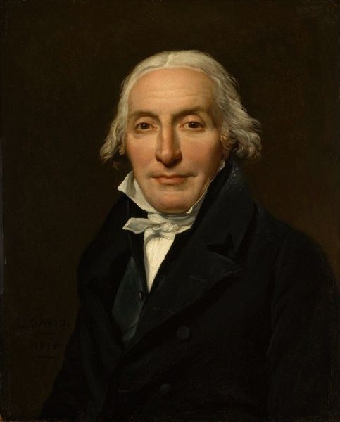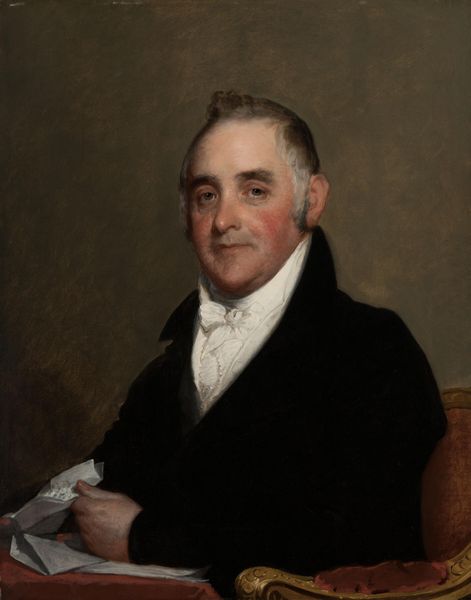 Curator: Let’s discuss this impressive portrait currently hanging here at the Rijksmuseum. It’s a work by Jan Adam Kruseman, dating back to 1850. It depicts Rodolphe le Chevalier, an Amsterdam merchant and one of the founders of the Holland Railroad Company. Editor: He seems like a man of serious composure. There's a weight in his expression, but his grip on the document in his hands looks soft. The palette is dominated by this intense dark jacket offset against that very light complexion, a nice touch from the painter. Curator: Indeed. Kruseman was a highly sought-after portraitist among the Dutch elite. Notice how the backdrop hints at both his affluence, signified by the drapery, and perhaps also an openness, reflected in the outdoor scene visible through the window. He appears as a public figure, a man engaged with the world. Editor: And what's fascinating is the contrast between that traditional composition and what the painting signifies—the emerging power of industry. Railroads were reshaping not just the landscape, but the very fabric of Dutch society at the time, altering how people worked, traded, and traveled. The man portrayed here made it all happen. Curator: Precisely. The choice to depict him with documents and ledgers symbolizes his professional standing and his direct impact on the infrastructural developments of the Netherlands. The portrait essentially communicates that business and finance have become the symbols of success in the Netherlands of the 19th Century. Editor: You know, it's all oil on canvas of course, and Kruseman’s technique creates a tangible sense of surface; there is a very palpable sense of fabrics in the painting; but thinking about his role as founder of the Railroad company, you realize this portrait represents the social ascendance of men with this knowledge about materials and manufacturing—men able to harness physical power and bring a whole country closer together. Curator: He was certainly successful at it, wouldn’t you say? Thank you for sharing those observations. Editor: Of course. These considerations always reveal fresh angles when observing art, even works like this portrait which seem so familiar.