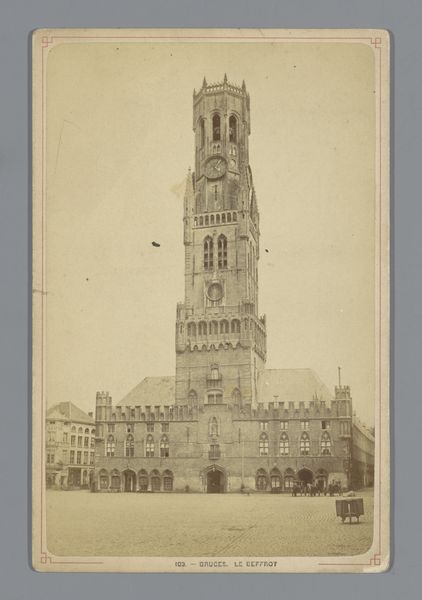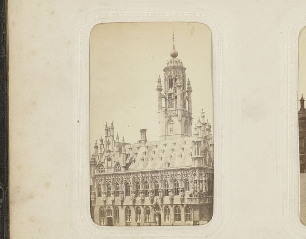 Curator: Welcome. We are looking at "Gezicht op het Stadhuis te Middelburg," a photographic print created around 1884 by Pieter Oosterhuis, currently held at the Rijksmuseum. Editor: Woah, there's something hauntingly beautiful about it. The sepia tones, the towering architecture… it feels like a memory surfacing from a dream. Makes me wonder what kind of stories those walls could tell. Curator: The image certainly conveys a palpable sense of history. Oosterhuis was known for his keen observation and detailed approach. Note how the lines converge towards the center, giving the town hall a position of undeniable power, wouldn’t you agree? Editor: Totally. The formal arrangement of shapes creates a striking impact! Although the clarity could have been slightly better. Did they have digital retouching back then? Curator: Certainly not! It’s inherent to photographic techniques of the time. Imperfections actually augment its qualities. However, examine how the composition is clearly articulated, despite this issue. Oosterhuis had an exceptional understanding of the interplay between light and shadow in cityscapes, very much in the style of the Dutch Golden Age masters. Editor: Yes, it’s remarkable how he captured so much detail with such limited technology, isn’t it? And that building looks seriously decked out with ornaments and statues! Talk about creating a landmark for a reason. The horses waiting look tiny in contrast! Curator: It’s precisely that contrast which engages our perceptions. Consider, also, the way he uses realism not just as an objective recording device, but to invoke the feeling of standing right there in the square. Editor: Right? It’s almost as if we’re sharing the frame with whoever waited for a ride that day. I can imagine them now… What a trip! Curator: An entirely valid way to react to Oosterhuis’ vision, wouldn’t you agree? A fusion of aesthetic construction combined with raw sentimentality—remarkably conceived within this photographic endeavor. Editor: Precisely! Art offers a personal encounter; it is intended to provoke emotions, regardless of form or methodology! Curator: Thank you for that astute comment. Editor: Likewise!