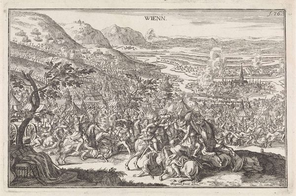 Editor: This is Matthäus Merian the Elder's "Departure of the Israelites," made with etching, circa 1625. It's rather small, but so detailed. What strikes me is the ordered march contrasted with the chaotic jumble of figures in the foreground. How do you interpret this contrast? Curator: The piece showcases a sophisticated understanding of contrasting textures and lines. The density of cross-hatching in the foreground creates a sense of depth, sharply juxtaposed with the more linear, rhythmic representation of the receding multitude. Note how this use of line directs the eye. Editor: I see what you mean about the lines. So, the etching technique itself emphasizes the themes of order and chaos in the composition? Curator: Precisely. The very materiality contributes to the thematic content, revealing how formal qualities embody meaning. This tension elevates the print beyond mere illustration. Editor: That gives me a lot to think about. I'm starting to look at it very differently now.