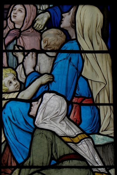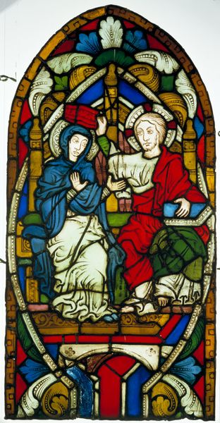 This is a glass panel depicting a deathbed scene, created in the early 16th century by Jan van Diependale. During this period, the status of women was largely confined to the domestic sphere. The composition shows a dying man, attended by a woman and a younger man. The woman, likely his wife, stands with a somber expression, while the younger man kneels in prayerful support. This domestic tableau is set against a backdrop of religious iconography, highlighting the intersection of personal grief and spiritual solace. The choice of stained glass, traditionally used in religious settings, elevates the personal drama of the deathbed to a scene of greater, almost biblical significance. This panel provides a glimpse into the emotional and familial dynamics of the 16th century.