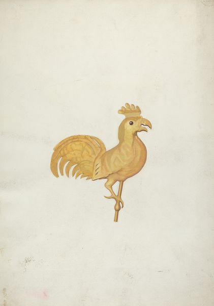 Editor: So, this is H. Langdon Brown’s “Weather Vane,” created around 1937. It appears to be a drawing, perhaps in watercolor or pastel, on toned paper. It’s a really charming, almost folksy depiction. What's your take on this piece? Curator: Well, this work interests me particularly from a cultural standpoint. Consider the era, the late 1930s, amidst the Great Depression. What role could such a simple depiction of a common object play in the art world and wider society? Editor: I guess it seems… nostalgic? Maybe a longing for simpler times, considering everything that was going on? Curator: Precisely! And consider weather vanes themselves – their presence on barns and public buildings speaks to a deep connection with nature and rural life. Brown might be tapping into this connection to evoke a sense of stability, something particularly valuable during that period. Who would be interested in viewing and purchasing this artwork? Editor: Hmm… maybe people who were migrating to urban centers but missed their rural roots? Or institutions looking to project a certain image? Curator: Good point! It's about the public role of art and its social function. Do you see how this seemingly simple image interacts with its historical context? What might have been Brown's intention when painting this weathervane, especially with that vibrant red eye? Editor: Now that I’m thinking about the red eye, it almost adds an element of… watchfulness. Like a guardian figure overlooking the landscape. I guess, overall, it’s less simple than I initially thought! Curator: Exactly! Art often reflects and shapes cultural narratives, making even a common object rich with socio-political significance. Editor: This makes me realize how much a work is tied to its original public consumption! Curator: Yes, how we approach history shifts our appreciation of the artwork itself. Thanks, I appreciate our reflections.