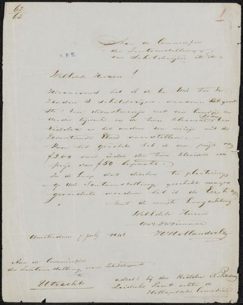 Curator: This artwork, “Brief aan Frans Buffa en Zonen” by Gerke Henkes, created sometime between 1875 and 1879, utilizes ink on paper. The writing, in pen, really stands out. It gives a sense of someone very intentionally crafting this missive. What grabs you about it? Editor: It feels very personal. It's like a snapshot of a private moment frozen in time. What do you see in it, beyond just a letter? Curator: Well, as an activist art historian, I am immediately drawn to the inherent power dynamics at play. Letters, especially those from this period, served as tools of commerce, social control, and the maintenance of power structures. Look at the very act of handwriting - the education, the leisure, and the social standing it implies. How might the contents of this letter, possibly concerning financial matters, reflect the complex socio-economic landscape of the late 19th century Netherlands? Who was Frans Buffa and Son and what power dynamics existed? Editor: That's a really interesting way to look at it. I hadn't considered the power aspect. Curator: Precisely! Now, consider the calligraphic style, indicative of Romanticism. Was this merely aesthetic, or could it have been performative, meant to convey a certain status or credibility? What societal expectations were present for letter writing at the time? Editor: So you're suggesting it's not just about the words but also about how they're presented and what that presentation communicates about the writer's place in society? Curator: Exactly. Art isn't created in a vacuum; it's always engaging with and reinforcing broader societal narratives. Reflecting on that interaction helps to bring light to art history, don't you think? Editor: Definitely! I never thought a simple letter could reveal so much. Thanks for expanding my understanding of its role and implications.
