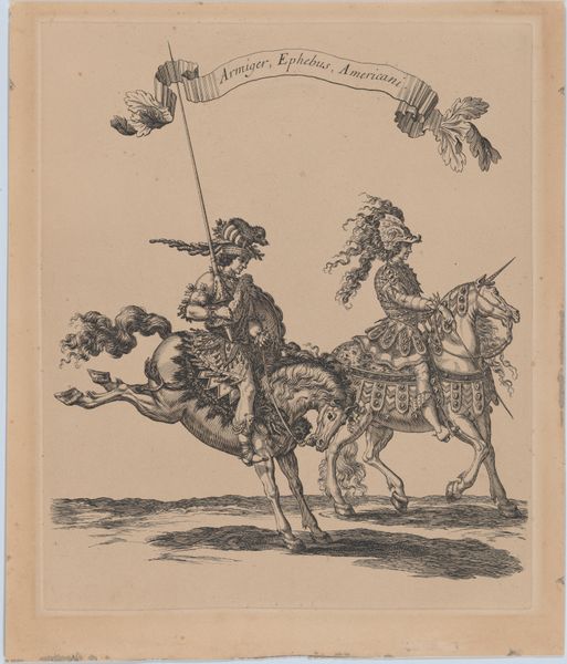 Hans Jørgen Kirksteen created this small engraving, “Rider Raising a Glass, with a Woman and Child in Front,” during the 18th century, a time of immense social change and burgeoning artistic innovation. The image depicts a man on horseback, exuberantly raising a glass, while a woman and child stand passively in the foreground. The scene raises questions about social class and gender roles, common themes in art of this period. What are we to make of the rider's jovial pose in contrast to the static, almost burdened, figures of the woman and child? The print invites us to consider how such images reflect societal structures and the experiences of individuals within them. It serves as a reminder that even seemingly simple scenes can carry complex narratives.
