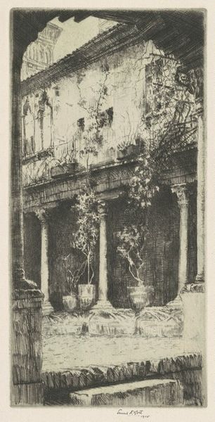 Carel Nicolaas Storm van 's-Gravesande created this charcoal drawing, "Binnenplaats van Abbazia di S. Gregorio" in June 1902. The drawing presents us with a courtyard scene, dominated by dense charcoal marks. The buildings are depicted with a palpable weight and substance, conveying a sense of age and permanence. The artist’s application of charcoal varies, creating contrasts in tone and texture. The dark, shadowed areas of the architecture juxtapose against the softer, more diffused light filtering through the courtyard. This interplay of light and shadow not only defines the forms within the composition but also evokes a particular mood—one of quiet contemplation. Van 's-Gravesande's mark-making in this drawing, and his strategic use of light and shadow, invites us to consider the relationships between the physical structure and its environment. The drawing becomes a study in how light transforms and animates static architectural forms. It reminds us that art is always in dialogue with its media, and with the world it seeks to represent.