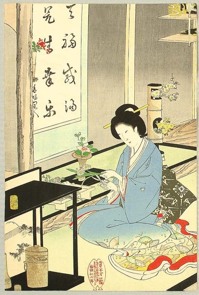 Editor: This print by Yashima Gakutei, "Woman Holding a Tortoise-shaped Paperweight," is fascinating. It seems to capture a moment of quiet contemplation, yet the surrounding imagery feels symbolic. What's your take on how this image might reflect its cultural context? Curator: It’s important to consider the role of prints like this within the Katsushika Circle. These images, produced for a specific artistic community, weren't simply decorative. The poems inscribed alongside the figure, combined with the auspicious symbols of the tortoise and crane, speak to the cultural values the circle sought to promote. Editor: Cultural values such as? Curator: The paperweight and writing implements suggests a cultured lifestyle, the crane represents longevity and good fortune, and the poems would have been appreciated within that artistic and literary circle. How do you think these details contribute to the print’s overall message? Editor: I see. It’s less about the individual and more about the artistic community and their shared values. Thanks, I hadn't considered that. Curator: Exactly! The image functions as a social object, reinforcing shared identities and aspirations.