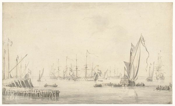 H. Veltman made this view of Den Helder and the Nieuwe Diep with pen, brush, and gray ink, later adding watercolor. These humble materials give the scene a delicate feel, belying the massive scale of the industrial shipping on display. The ships appear to be a mixture of sail and steam power, reflecting a moment of technological transition. The drawing method itself mirrors this blend: pen for precision, brush for atmosphere. Look closely, and you'll see how the artist uses thin washes of watercolor to suggest the vastness of the sky and water. The meticulous linework captures the details of the ships and buildings, hinting at the labor involved in their construction and operation. Veltman's choice of materials, combined with his careful technique, underscores the importance of maritime trade and naval power to the Dutch economy and its global reach. It reminds us that even a simple drawing can reveal complex stories about industry, innovation, and the human drive to connect across the seas.