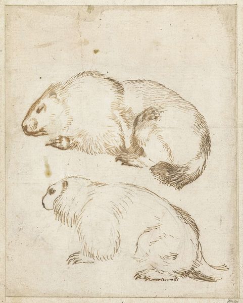 Curator: This charming sketch presents three studies of a pug dog, by Susanna Duncombe, an artist born in 1725. Editor: Aw, they’re like little fluffy potatoes! It's interesting how Duncombe captured the essence of the animal with such simple lines. The shadows almost feel like an assembly line. Curator: Exactly! Duncombe was part of a circle of female artists who were gaining recognition. These sketches weren't simply idle doodles; they were part of a larger culture of artistic expression within a specific social milieu. Editor: I'm drawn to the handmade quality – you can almost feel the pressure of the graphite on the paper. It highlights how labor and skill were involved in creating these images for a growing market of pet ownership. Curator: Indeed, it reflects the increasing popularity of pets and domesticity in 18th-century society and its changing attitudes. Editor: Seeing the texture of the paper and the marks of the artist's hand really deepens my appreciation. Curator: It gives us a peek into the social and artistic climate of Duncombe's world. Editor: It’s a reminder that even simple sketches can tell a bigger story about production and society.