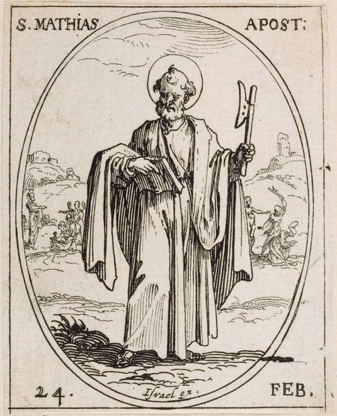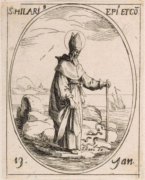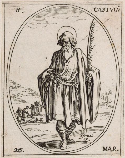Curator: Here we have Jacques Callot's diminutive etching, "Saint Romaldus," currently held at the Harvard Art Museums. Editor: It has this strange, austere beauty, doesn’t it? Stark lines framing a figure lost in contemplation, a world worn down by faith, perhaps? Curator: The piece provides a fascinating window into 17th-century printmaking. Callot's technique allowed for detailed reproduction, vital for disseminating religious imagery to a wider audience. The emphasis on the process and materials suggests an understanding of mass production influencing religious devotion. Editor: It reminds me of illuminated manuscripts, only far more democratic. It's as if the act of prayer, of seeking something bigger than oneself, is etched into every line. You almost sense his breath, and the smell of paper, and ink! Curator: Precisely. Callot's etching exemplifies how art serves as both a devotional object and a product of its time. Editor: A haunting reminder that even in the smallest of things, the spirit finds a way to bloom.