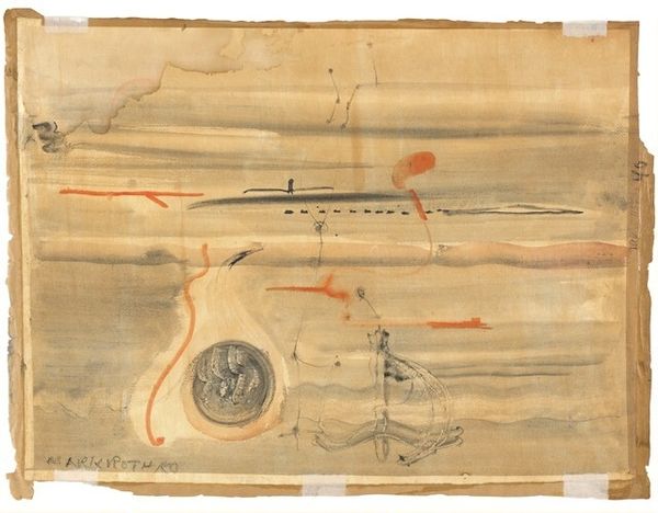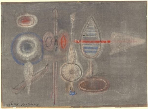 Editor: This is "Untitled [verso]," a drawing done in ink and colored pencil by Mark Rothko between 1945 and 1946. The composition is striking with a prominent circular form, and two red bars at the bottom, the surface has this lovely textured quality. How do you interpret this work, especially in relation to the materials used? Curator: What’s compelling here is Rothko's apparent willingness to expose the process. Look at the rough quality of the ink, how the layers build up. It's as though we are seeing the very act of creation, the labor involved in constructing the image. The use of common materials like ink and coloured pencil blurs any line between fine art and the everyday acts of mark-making. Editor: I see what you mean, the process is very exposed! Do you think that relates to its time of creation, the mid-1940s? Curator: Precisely! Consider the socio-economic context: post-war austerity would influence resourcefulness in artistic practices. Materials at hand shape the means of expression. Rothko wasn't aiming for some refined aesthetic but exploring the inherent qualities of modest materials to communicate deeper human feelings. Editor: That's fascinating. I hadn’t considered the post-war impact on artistic materials and processes like that. So, the 'unfinished' quality… Curator: It subverts expectations of completion! Instead, Rothko emphasises the conditions of production and its relationship to human labor in that specific historical setting. This invites us to rethink artistic value beyond aesthetics and recognize it within production processes and materiality itself. Editor: Thank you, this makes me look at the drawing as almost documenting an activity rather than just an image. Curator: Indeed, a record of making and thinking, rather than merely depicting. A conscious act of working.