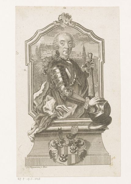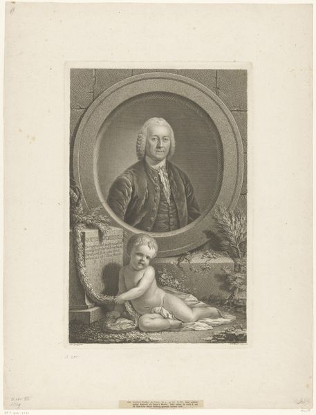 Editor: This drawing, “Putto with Portrait Medallion of an Artist” by Roeland van Eynden, was created sometime between 1757 and 1819 using ink on paper. It's quite striking, a monochrome tableau. I’m immediately drawn to the composition; there’s so much going on! How do you interpret this piece, particularly in terms of its formal elements? Curator: Initially, consider how the artist uses line. Note the distinct difference in the rendering of the putto compared to the more defined lines of the portrait medallion. The softness of the putto is created through delicate, almost feathery lines, imbuing it with a sense of ethereal grace. The hard edges and detailed hatching on the portrait lend it a sense of authority and presence, creating a captivating visual tension. Editor: I see that. So, the contrast isn't just in the subject matter, but how they’re depicted…almost like two separate realities intersecting? Curator: Precisely! Further, consider the deployment of tonal values. The artist uses chiaroscuro - the sharp contrast between light and shadow - to give depth and volume to the forms. Notice how the darkest tones are strategically placed to emphasize the contours and details, thereby drawing the eye to crucial focal points within the composition. Does the orientation of each compositional element matter, would you say? Editor: Definitely! The artist is drawing attention to certain attributes; for instance the angle and placement of the drawing implements and partially-finished head may be intended as self-promotion. Thanks for sharing your expertise. I'm taking away how a piece's inherent design features—such as light, line, and subject selection--make for an amazing experience when well executed. Curator: Indeed. Observing how those features converge in art enhances how we discuss and interpret artwork.