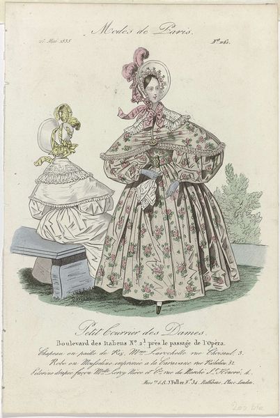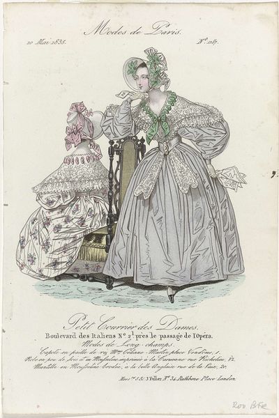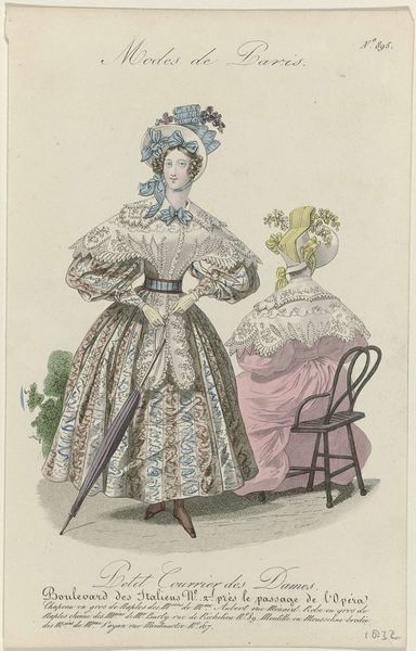 Editor: This is a watercolor drawing from 1831 entitled "Petit Courrier des Dames, 1831, No. 797 : Chapeau des M.sins de Mme Seuriot (...)" The level of detail is astounding. The colors, while subtle, give a clear sense of the fabrics. How do you interpret the piece, looking at it formally? Curator: Note the lines first: how they delineate form and volume, particularly in the billowing sleeves and skirt. The artist masterfully employs watercolor to capture light and shadow, creating depth and texture on the paper. The careful rendering of the floral motifs adds to the sense of restrained ornamentation. We should also acknowledge the arrangement of the figures and their relationship to each other: what structural components come to the fore? Editor: The woman standing in the dress takes up most of the composition, her positioning creating almost two separate portraits in one piece. The seated figure seems to be an afterthought, in comparison. Is there something about the style that reinforces that contrast? Curator: Consider the treatment of the background; it is minimized, focusing our attention on the interplay of forms within the foreground. How do the diagonals of the chair affect our understanding of the pictorial space? How would the piece read if the seat was placed square-on? It is in this precise, structured, formal analysis that a reading is achieved. Editor: The analysis makes so much sense now. Thank you! Curator: My pleasure. Every work, even fashion illustrations, yield much fruit with precise, informed observation.