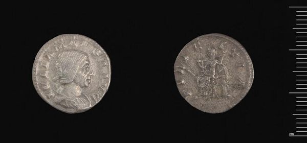 Curator: The Denarius of Julia Domna in the Harvard Art Museums offers a glimpse into the power and image-making surrounding the Roman imperial family. Editor: The low relief gives it a worn, almost ghostly quality, especially considering the silver alloy. What can you tell me about its composition? Curator: Julia Domna, wife of Emperor Septimius Severus, was a powerful figure, and her portrait on this coin was a key tool in visualizing imperial authority throughout the vast Roman Empire. Editor: Note how the inscription encircles her image, almost defining her as an object of state. It’s quite different from the fluid lines of Hellenistic portraiture. Curator: Absolutely. It's a carefully constructed image, meant to project stability and legitimacy for a dynasty that had recently seized power. Coins like these acted as miniature billboards, shaping public perception. Editor: The details of the engraving are impressive, but it's the way the light catches the metal's surface that really brings out the dimensionality. Curator: Studying this coin reveals not only artistic choices but also the calculated use of imagery in ancient political strategy. Editor: Indeed. It’s a tangible object of power, rendered in miniature.