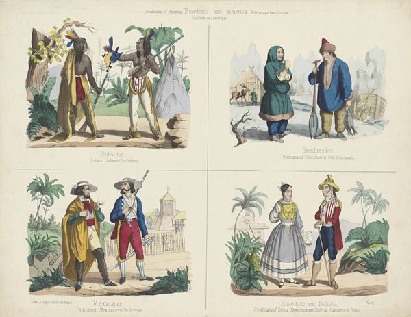 Arie Willem Segboer created this print, titled "Uit den vreemde / (2)", which translates to "From Abroad," as part of a series of Dutch children's prints. Segboer’s work reflects the period's fascination with and representation of foreign cultures through the lens of Dutch colonialism and trade. Here we see different individuals identified by their nationality and occupation; a Spanish farmer, a Javanese basket seller, a Mexican woman, a camel driver, a Chinese fruit seller, and a Persian nobleman. The illustrations offer a glimpse into the diverse roles people played in their respective societies but are also indicative of the period’s exoticizing gaze. Notice how each figure is presented in what was considered typical attire and engaged in activities that defined their cultural identity for a European audience. The print invites us to consider how identities are constructed and perceived across cultural boundaries, particularly in contexts shaped by power dynamics. It makes me think about how we look, and who is looking back.