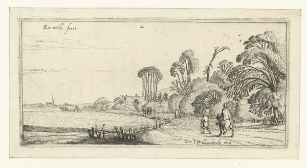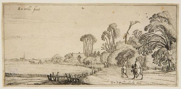 Esaias van de Velde created this landscape view near Hillegom using etching, sometime before 1630. The composition uses a low horizon line, emphasizing the flat Dutch landscape stretching towards the distant village. See how the artist uses a simple foreground, with detailed rendering of a fence, to transition to the middle ground, where figures walk and ride along a path. Notice how the scene is divided into zones of light and shade, created by the cloud cover above. This division adds depth and a sense of atmosphere to the otherwise sparsely detailed scene. Velde's use of line is particularly effective; he varies the thickness and density of the etched lines to suggest texture and distance. The cluster of trees on the right contrasts with the open field on the left, balancing the composition. The formal structure directs our eye through the landscape and suggests a journey—both physical and perhaps contemplative—through the Dutch countryside.