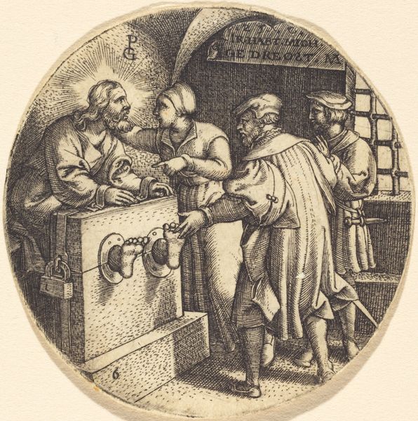 Curator: Georg Pencz, an artist associated with the German Renaissance, is likely the author of this print, an engraving titled "To Feed the Hungry." Its compact, circular composition contains a wealth of social and historical information. Editor: My immediate feeling is that of a hushed, tense atmosphere. It feels as if a decisive, potentially fraught moment is unfolding. I wonder what triggered this scene. Curator: Precisely! This is a figuration of a specific, if contested, passage from the Gospel of Matthew, often dubbed one of the "Acts of Mercy." Consider the central figure's halo, immediately positioning him as a divine presence surrounded by everyday people. We’re looking at an articulation of religious doctrine influencing civic life, no doubt charged with social implications regarding care. Editor: The light source is odd, though. Is it external, like divine illumination, or perhaps just skillful manipulation of highlights within the engraving itself? And why is that little dog so desperate, almost mirroring the plea of the man being fed? It seems to know a treat when it sees one. Curator: That, I suspect, draws attention to the intersection of charity and class. The contrast between the presumed comfort of the seated figure and the obvious need of the others emphasizes power dynamics inherent in these acts of supposed "mercy." The server at the right, caught mid-pour, has an uneasy tension in his brow as if aware of how conditional their generosity appears. Editor: You're probably right about the artist revealing a darker layer. There’s something almost staged about their interaction. But it’s still really touching, you know? Someone getting a bit of succor, even a gesture of that kind of relief is nothing to dismiss, however conflicted! It feels almost theatrical, and yet painfully raw and intimate too. It's complicated, like life often is! Curator: It's through examining those very complexities—religious decree intersecting with practical social inequities that Pencz achieves an image ripe for discussion. Each carefully rendered line builds towards an ongoing question around responsibility. Editor: Ultimately it's about our mutual recognition of one another's essential human needs. Seeing it visually somehow solidifies the concept, I feel like I better remember it from here on out.