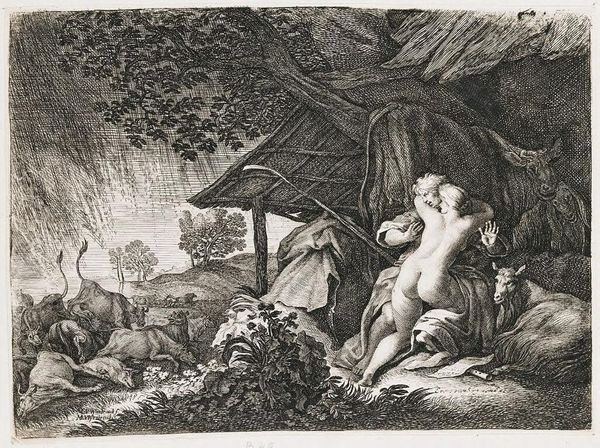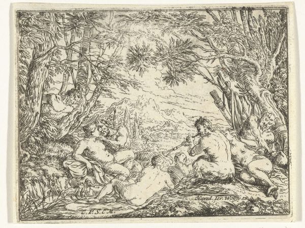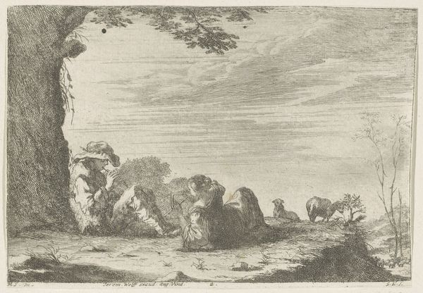 Editor: This is *Mercurius sust Argus in slaap*, an etching from perhaps 1600 to 1660, by Moyses van Wtenbrouck. It depicts a pastoral scene with two figures in the foreground. I find the contrasting use of light and shadow quite captivating; it gives the piece a lot of depth. What strikes you most about its composition? Curator: Its structure. The division between light and shade acts as more than mere illumination; it serves as a stark binary, almost allegorical in its construction. Consider the density of the cross-hatching in the canopy versus the open, airy strokes used to render the distant fields. Do you discern a similar binary between foreground and background? Editor: Yes, I think so. The foreground feels much more dense and immediate compared to the background, which is more sparse. Curator: Precisely. Furthermore, observe how the figures and the bovine occupy a liminal space between these contrasting textures, functioning as a crucial pivot point within the artwork's structural arrangement. It seems as if they are caught between the concrete and the ideal. Does this resonance extend beyond the formal elements to encompass thematic or symbolic nuances? Editor: That's a really interesting idea! So, do you think that tension between foreground and background informs the way the narrative of the piece is read? Curator: Indeed. Wtenbrouck has managed to distill and concentrate fundamental structural relationships into visual components. It offers an intricate dialogue concerning form, texture, and representation, no? Editor: Absolutely! Looking at it this way has totally changed my perspective. It is like the technique itself holds as much meaning as the figures depicted. Curator: Quite right, our appreciation has been enriched by engaging with its intrinsic compositional qualities.