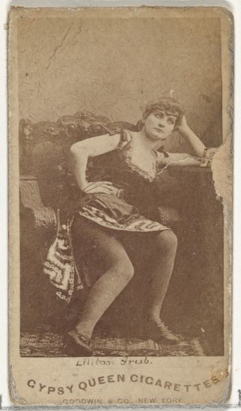 This photograph of Mlle. Semin, part of the “Actresses” series, was produced by Wm. S. Kimball & Co. as a cigarette card. The sepia tones and the card's small dimensions immediately suggest an intimate viewing experience, typical of collectibles from this era. The subject, Mlle. Semin, is captured in a carefully arranged pose, leaning on a chair with one leg slightly raised. This posture, combined with her gaze, conveys a sense of practiced allure. Compositionally, the photo operates through a system of coded signs. Her attire and pose represent a form of spectacle, inviting the viewer into a complex interplay of performance and consumer culture. Consider the chair, a prop that symbolizes both support and a stage-like setting. It is not merely a functional object but a structural element that frames Mlle. Semin, enhancing her performative role. This intertwining of the personal and the commercial reflects broader themes of identity and representation within a burgeoning media landscape. These cards were not just advertising; they were cultural artifacts, shaping and reflecting the values of their time.