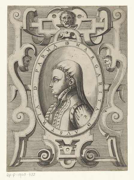 Editor: Here we have Nicolò Nelli's 1567 engraving, "Bust profile portrait of Catherine de' Medici." It's quite detailed, even intricate, but there's something severe about the Queen's expression. What stories do you see reflected in this piece? Curator: It’s interesting you pick up on the severity. While the ornamental frame might suggest celebration or reverence, Nelli’s choice to depict Catherine in profile aligns with the tradition of portraying rulers in a detached, almost stoic manner. How do you think this imagery reinforces or perhaps challenges her political power, given the turbulent context of 16th-century France with religious conflicts and factionalism? Editor: That's a great point. It seems like a way to project authority. Curator: Precisely! Consider her role as Queen Mother during a period of immense religious and political tension. Does this portrait subtly argue for her strength and legitimacy through visual cues? It also appears as an engraving within a book. How might its wide distribution impact opinions regarding Catherine? Editor: So it's not just about aesthetic representation, but about circulating a very specific *idea* of Catherine de Medici. Curator: Exactly. What power dynamics are at play when images become a form of political messaging? Remember, her reign was criticized, even demonized, for religious persecution and foreign interference. Editor: I hadn't considered the propaganda aspect so explicitly. Curator: That interplay of art, politics, and social perception is key here. By thinking about how gender and power were visually negotiated during the Renaissance, we can develop our critical understanding of its enduring legacies. Editor: I'm now seeing this as so much more than just a portrait! Curator: It’s a testament to how art serves as both a reflection and a tool for shaping historical narratives.