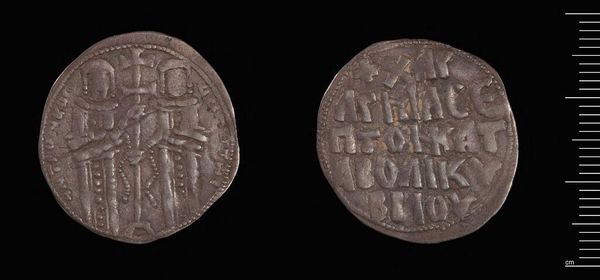Curator: This is a two-thirds miliaresion of Constantine X, originating from Constantinople. Editor: The worn texture and the subtle sheen of the metal give it a palpable sense of history. Curator: Absolutely. These coins weren't just currency. They served as imperial propaganda, projecting power and legitimacy. The imagery and inscriptions played a crucial role in shaping perceptions of Constantine X and the Byzantine state. Editor: You can also discern a deliberate composition. The weight of the imagery and text are carefully arranged within the circular form. It's a sophisticated approach to design. Curator: Consider the societal implications. The production and distribution of such coins influenced not only economic exchange but also social cohesion and religious identity. It reminds us that objects, no matter how small, carry immense cultural weight. Editor: Yes, observing its aesthetic decisions prompts me to contemplate how it conveyed meaning beyond simple economic value. Curator: Indeed. And it prompts a deeper understanding of Byzantine culture. Editor: A fittingly weighty conclusion, for such a tiny, but evocative artifact.
