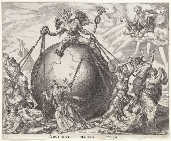 Zacharias Dolendo made this print, "Omnium rerum Vicissitudo est," using the intaglio process. The design is incised into a copper plate, then inked and pressed onto paper. Consider the labor involved in producing such intricate lines. The image shows the world as a sphere, surrounded by figures representing the changing nature of life. It is a reminder that all things are subject to change. The choice of printmaking as a medium underscores this point. Prints, by their nature, are made for distribution. They were a key technology of the time. They allowed knowledge and ideas to circulate more widely than ever before, and the labour to produce them became widespread too. In this work, Dolendo turns the world itself into a printed image, commenting on the new order. By recognizing how materials, making, and context intertwine, we gain a deeper understanding of this image, beyond traditional categories.
