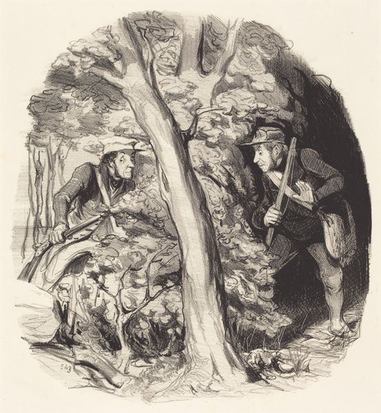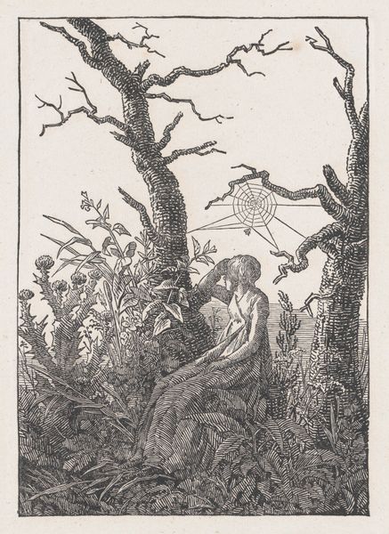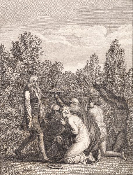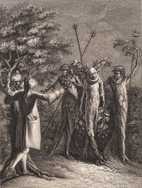 Curator: What strikes me immediately is the almost palpable sense of awe. The density of the scene and the way the figures are depicted create such an unnerving sensation. Editor: Indeed. Let’s delve a bit deeper. This etching, entitled "Træmenneskene i bøn paa den ubegribelige guds dag" or "The Tree People Praying on the Incomprehensible God's Day", was created by J.F. Clemens between 1786 and 1788. It’s currently part of the collection here at the SMK, Statens Museum for Kunst. Curator: The title itself piques my interest. 'Tree People'. There is a merging of human and nature—beings of nature and humanity coexisting. Editor: It aligns strongly with the Romanticism movement, where the boundaries between humans and nature often blurred. Notice how Clemens renders the figures – they appear to rise directly out of the forest floor like trunks of trees, their forms are elongated and ghostly, and there are about ten of them watching the kneeling character. The textures mimic bark. Curator: Absolutely, and the way the kneeling figure presents themselves, is a deliberate contrast. They're a lone, recognizable human shape submitting themselves to the divine within that primeval gathering, equipped with both cloak and sword. It is worth examining how this reinforces social hierarchies in this society where there is such reverence for land and country. It's about human connection to nature and authority, surely? Editor: I wonder if they're surrendering their will or acknowledging something much larger than themself? What does this imply for society and the power it welds? We should note the print medium itself adds to this conversation, a medium meant for wider distribution, and that gives it added impact in cultural history, and perhaps political meaning? Curator: Good point. This invites contemplation on both a personal and public level – the scale is intimate but hints at something vast and timeless. It has certainly stayed with me. Editor: Yes, me too. Clemens truly captures that feeling of sublime wonder and inherent humanity, even in the face of the incomprehensible. It reminds us that the questions about our place in the world persist through time.