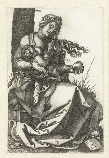 Editor: This is Sebald Beham's "The Virgin with the Pear," a small engraving. The detail is incredible, especially in the Virgin's draped clothing. What strikes you about this work? Curator: I’m interested in the economic factors influencing the printmaking process at the time. Consider Beham's workshop: Who were the laborers? What tools did they use? How would the economics of print distribution impact Beham's art? Editor: That's fascinating; I hadn't considered the printmaking process itself. Curator: Thinking about these factors shifts our focus from solely artistic vision to the material conditions of art production. It allows us to rethink value and creation itself.