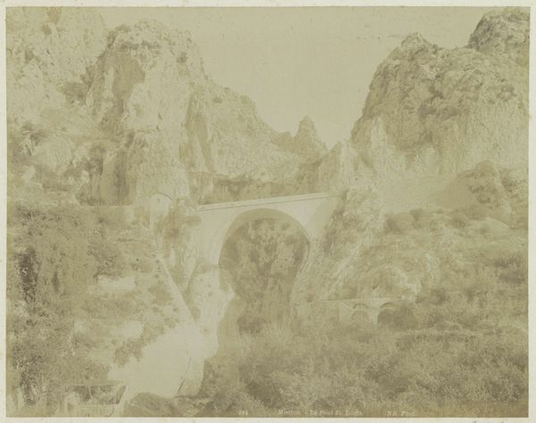 This is an undated photograph of the coast of Menton with nearby places, made by Henry Pauw van Wieldrecht. This image invites us to consider the relationship between landscape, engineering, and identity at the turn of the 20th century. Wieldrecht, who lived between 1863 and 1912, likely created this image during a time when photography was increasingly accessible but still imbued with the power to shape perceptions of place. The bridge becomes a stark marker of human intervention in the natural world, a symbol of progress. The image appears to highlight the tension between the imposing, rugged terrain and the human desire to traverse and tame it. Consider how the framing of the photograph—the bridge positioned between the cliffs—impacts our understanding of the scene. What does it mean to build a bridge, both literally and figuratively, between different spaces and communities?