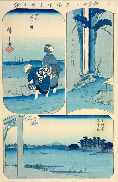 Editor: This delightful woodblock print, "Cutout Pictures of Famous Places in Edo" by Utagawa Hiroshige, is awash in blues. It feels like a collection of postcards from old Tokyo. What do you see in this piece that speaks to you? Curator: It whispers of a bustling city life, a collage of fleeting moments. The artist juxtaposes intimate glimpses of daily life. It’s not just about pretty landscapes, it's about embedding you in that world! Did you notice how Hiroshige uses these fragments to create a larger narrative of Edo? Editor: Yes, it is quite interesting! Thank you so much for this interpretation! Curator: My pleasure. Let us find our own fragments, and see how they piece together.