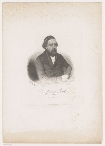 Editor: This is "Portret van Friedrich von Bodenstedt," made sometime between 1836 and 1880 by Conrad Friedrich Merckel. It's a print, possibly an engraving, and it's incredibly detailed despite the light pencil work. It reminds me of those photographs where everything's slightly faded. What stands out to you, just looking at its formal elements? Curator: Immediately, I note the strategic use of line. Consider how Merckel employs delicate, almost ephemeral lines to construct the sitter's face and form, versus the denser, cross-hatched lines used to define his clothing. This juxtaposition not only creates depth, but it directs the viewer's gaze. Note also the strategic deployment of light and shadow; ask yourself, how does it sculpt the face and imbue the portrait with a sense of psychological depth? Editor: That makes a lot of sense! It's almost like he's using different weights of lines to describe different textures—the soft fabric of the waistcoat versus the crispness of his jacket. And the light seems very directional, almost theatrical. Is that contrast key to understanding its composition? Curator: Precisely! This play of light serves a critical function. It elevates the sitter and lends the figure an air of distinction. Now consider the negative space, the void around the portrait. It serves not merely as background, but rather as a compositional element. The unadorned background isolates the sitter allowing the eye to focus intently on every meticulously rendered line. The work prompts questions. Editor: I hadn't considered how important that empty space was. Thinking about it now, it really does focus your attention. So it’s not just what is there, but what *isn’t* that shapes how we see the piece. Curator: Indeed! And by understanding how an artist deploys these formal strategies, we can get a clearer appreciation of its power. Editor: That's given me a whole new appreciation for this piece!