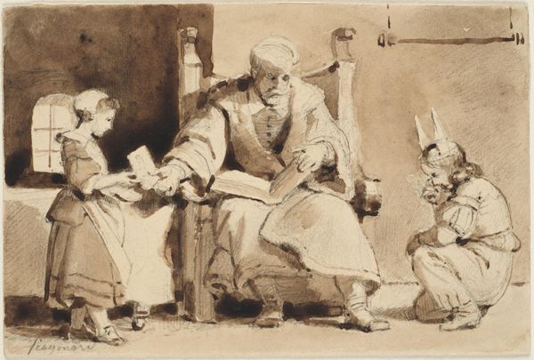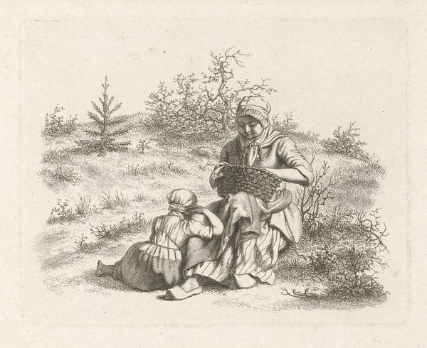 Editor: This is "Twee studies van een zittende vrouw en jongetje," or "Two Studies of a Seated Woman and Boy," a pencil drawing by Pieter van Loon from 1842. The quick strokes give it an intimate, almost documentary feel. What strikes you about it? Curator: Immediately, I'm drawn to the visual language employed here. Observe how the bonnets worn by the women function almost as halos, obscuring their faces and thus perhaps elevating their status in the domestic sphere. What psychological space does that create, do you think? Editor: It's interesting you say halos because they do create a sense of reserve. Do you think that reading would have been obvious to viewers at the time? Curator: Possibly. These head coverings served not just as markers of identity and piety, but as visual boundaries. Clothing has long served a purpose beyond warmth or modesty, hasn’t it? Think of how cultures denote roles, relationships, even emotions through dress. The artist uses this to invite us into the private lives of his subjects but also keeps us at bay. The gaze isn't reciprocated. Editor: That's a powerful observation! I hadn't considered how much clothing communicates in this context. I guess the academic style does lean into portraiture but doesn't necessarily need a face? Curator: Precisely! And it prompts us to reflect on how we perceive and understand images from a vastly different time. The image persists, the people are long gone. What endures is the encoding of meaning, layer upon layer, still there for us to unravel. Editor: I find myself seeing this drawing in a completely new way. Thanks for showing me how clothing operates as another kind of symbolic language. Curator: My pleasure. Hopefully, our listeners now might see it with fresh eyes too.
