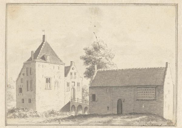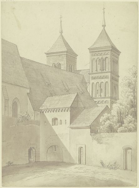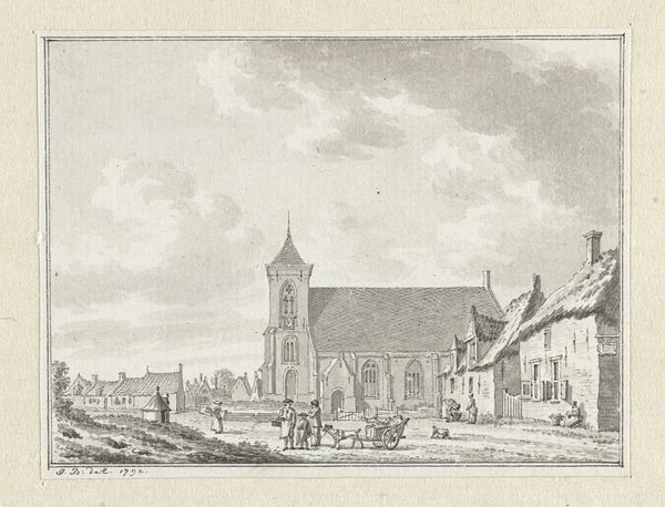 Editor: Here we have "The Church at Laeken near Brussels," a drawing in ink by Gerrit Lamberts, created sometime between 1786 and 1850. The subdued greyscale palette and realistic style give it a very documentary feel. How do you interpret this work? Curator: Beyond the literal depiction, consider the era. Lamberts likely captured this church amidst societal shifts following the Enlightenment. Note the solitary figure. Is this a commentary on faith in a changing world? How does the artist subtly engage with questions of institutional power and individual experience? Editor: That's an interesting perspective. I was just seeing a simple architectural drawing, but you're situating it in a whole context of social change. Does the church’s prominence within the composition perhaps represent the Church’s dominance? Curator: It’s possible. Yet, the work is also quite understated. Think about artistic license and intent, but consider the limitations of the artist's societal position and potential patrons. Did they seek affirmation of power, or a questioning of it? Remember too, art isn’t created in a vacuum, but as a response, both consciously and unconsciously, to these issues. Editor: I see your point. It's less about a clear answer and more about understanding the questions the work provokes. Curator: Precisely! The drawing prompts us to ask those critical questions, connecting the past to present conversations about power, faith, and societal transformation. The personal is political. Editor: I'll definitely look at these older works differently now, considering their relationship to broader cultural and social narratives. Thanks for your insight.