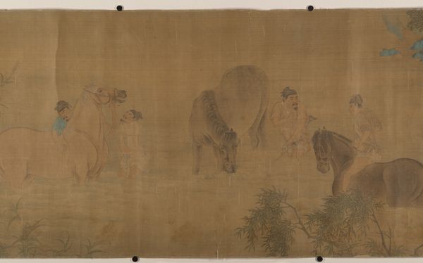 Editor: So, this watercolor painting on silk is titled "Water Buffalo," and it's an anonymous piece from sometime during the Qing Dynasty. It feels very pastoral, and the muted colors give it an almost dreamlike quality. How do you interpret this work, especially considering its materials? Curator: It’s intriguing how the artist uses watercolor on silk, media traditionally associated with refinement and high art, to depict such a common, almost quotidian scene of rural labor. The water buffalo becomes the central tool of production here. Editor: Tool of production… that's interesting. So, you’re saying that the choice of portraying labor on expensive silk challenges traditional class boundaries? Curator: Precisely! Consider the socio-economic context. Who could afford silk, and what kind of imagery was usually deemed appropriate for it? This image elevates the everyday, bringing the means of sustenance into a realm usually reserved for scholarly landscapes or courtly portraits. Editor: I see what you mean. It’s not just a pretty picture; it's about labor, value, and who gets to be represented in art. Does the repetitive use of color further this argument? Curator: Yes, notice the limited palette. It draws attention to the actual making of the piece. It feels deliberately unembellished, focusing attention on the material conditions of both the represented labor and the art-making process. It begs the question: what are they worth? Editor: So, by focusing on the materials and labor, this painting prompts us to think about the value we place on both art and everyday life. I never would have considered the art in that way, initially! Curator: And hopefully, that’s a perspective you'll carry forward. Always consider how the 'stuff' of art reflects the stuff of life.