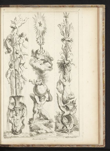 Michel Liénard made this print titled "Drie friezen en een kandelaber," meaning "Three friezes and a candelabrum" using etching and engraving. These processes involve meticulously incising lines into a metal plate, which is then inked and printed onto paper. The print depicts various decorative elements: friezes adorned with botanical motifs, and a candelabrum design featuring cherubic figures. The precision of the etched lines gives a sense of depth and texture to the images. Such prints played a crucial role in disseminating design ideas during the period, serving as a resource for artisans and manufacturers. They offered patterns for embellishing furniture, textiles, and architectural elements. By making designs widely available, printed images like these helped to standardize taste across regions and social classes. The candelabrum design combines classical motifs, such as the cherubs, with naturalistic elements like vines and foliage. The print bridges the gap between fine art and craft, revealing how artistic expression and technical skill were closely intertwined. Understanding the context of its production sheds light on the cultural values and design aesthetics of the time.